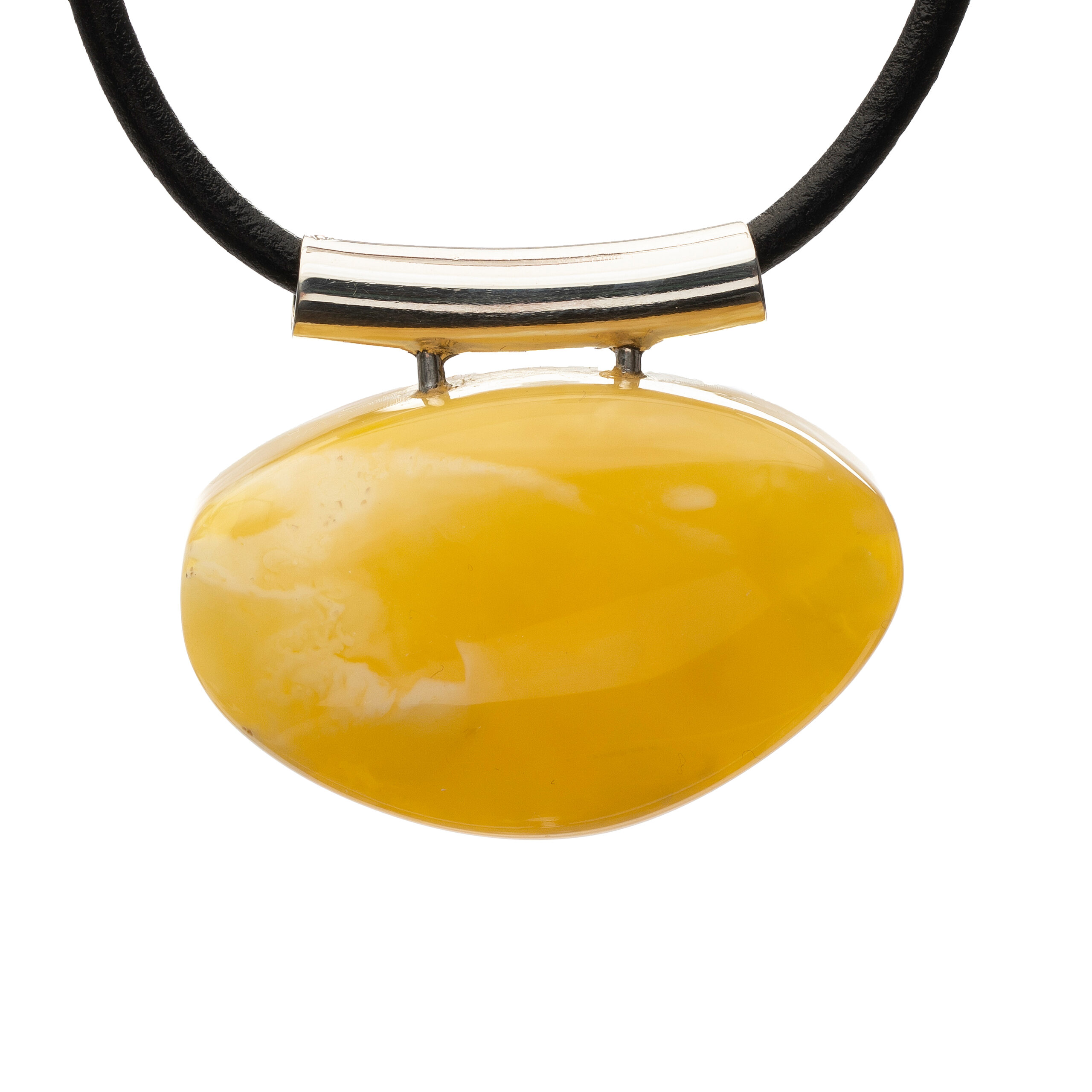 Dieses Schmuckstück bringt den wertvollen, gemaserten gelben Naturbernstein mit seinem satten Farbton und seiner Leichtigkeit zu Geltung. Der Anhänger ist ein handgearbeitetes Unikat in Sterlingsilber 925. Die ursprüngliche Form des Rohbernsteins ist erhalten geblieben.