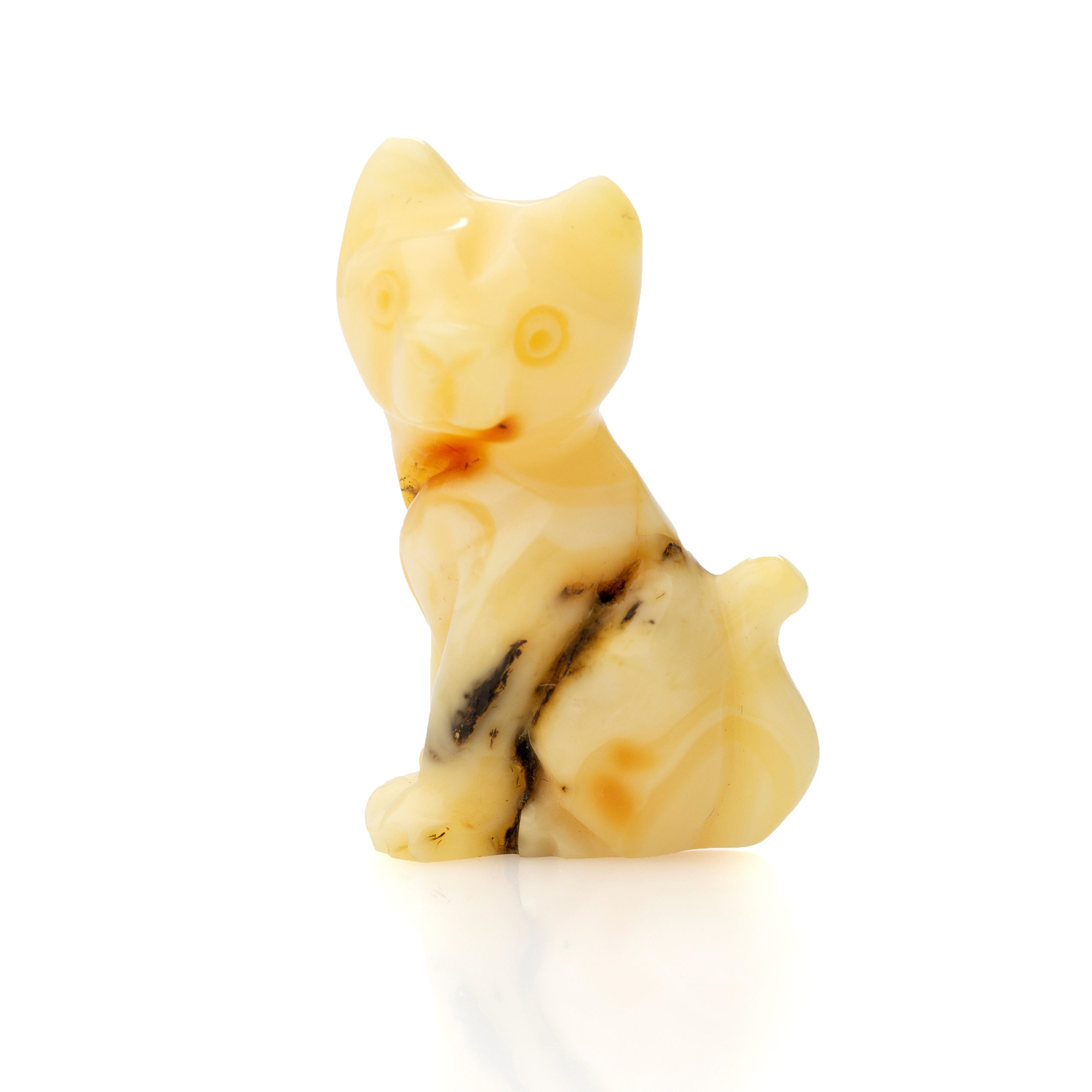 Diese Katze wurde aus gelblich, weißem Naturbernstein geschnitzt. Überreste der Verwitterungsschicht des Naturbernsteins sind oberflächlich erhalten geblieben. Kleine Erdeinschlüsse sind sichtbar.