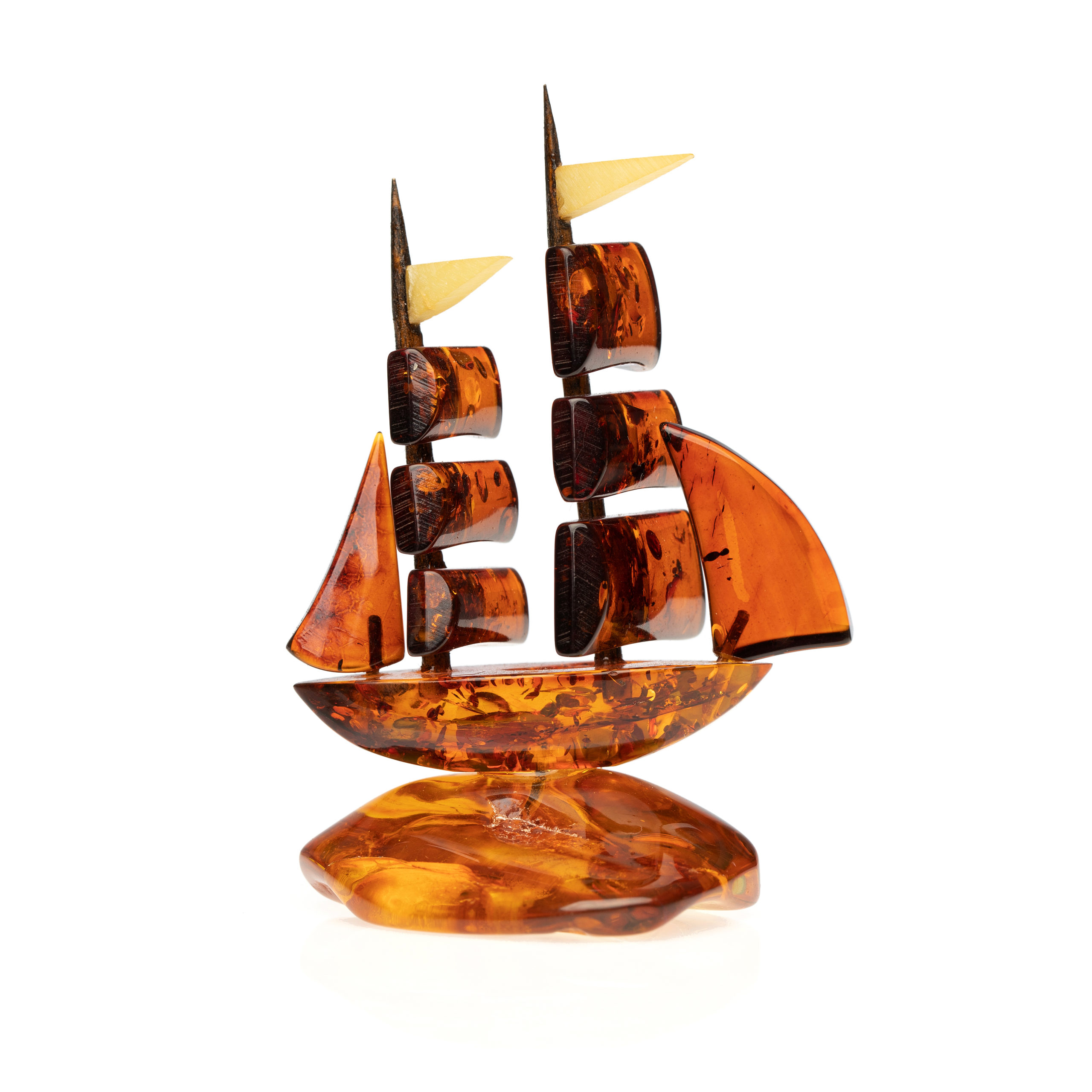 Dieses Schiff wurde aus cognacfarbenem durchsichtigem und gelblichem Bernstein geschnitzt. Seine Masten bestehen aus gebeiztem Holz.